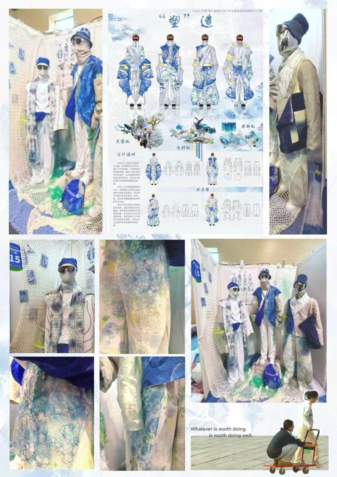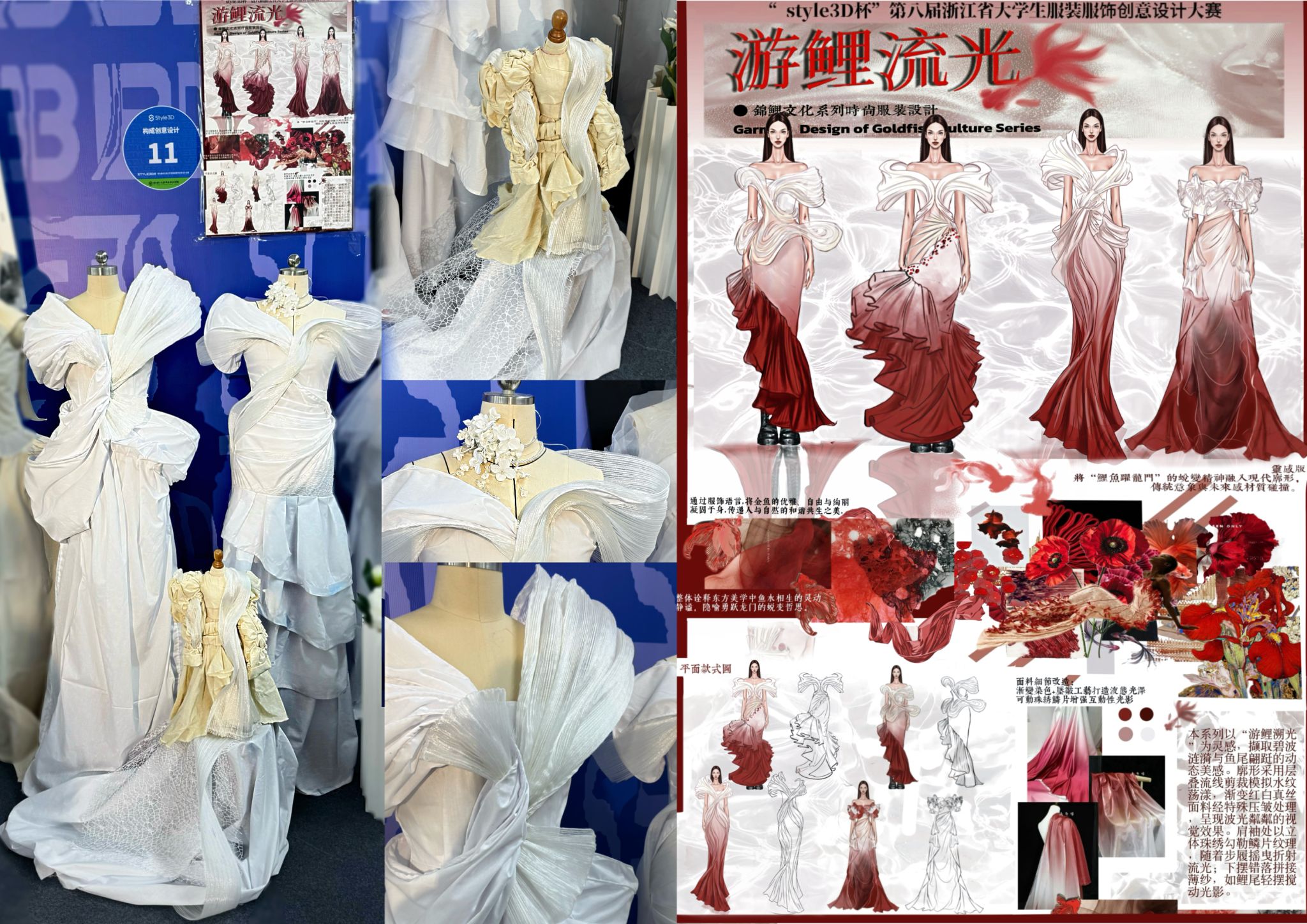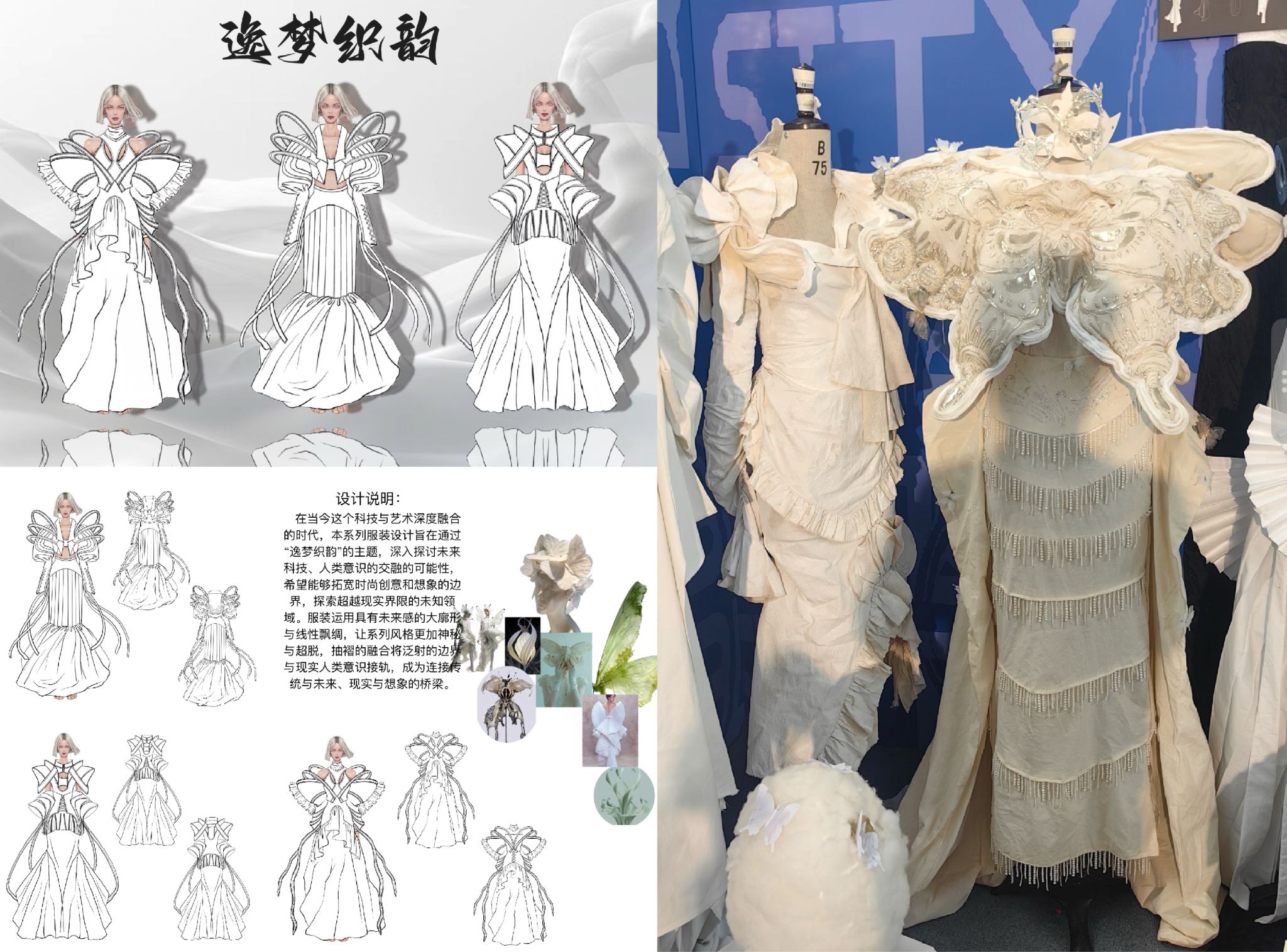 决赛阶段包含实物展示、现场制作与现场答辩三个环节,全面考察学生的创新意识、实践能力与综合素养。在强手云集的赛场上,艺术设计学院服装与服饰设计专业的同学们凭借独特的创意构想、前沿的数字技术应用与精湛的现场表现脱颖而出。作品不仅深刻诠释了“共生”理念,更巧妙运用Style3D等数字化设计工具,将虚拟构想转化为充满生命力的时尚表达,赢得了评委的高度认可,为当代时尚设计注入了蓬勃的青春力量。