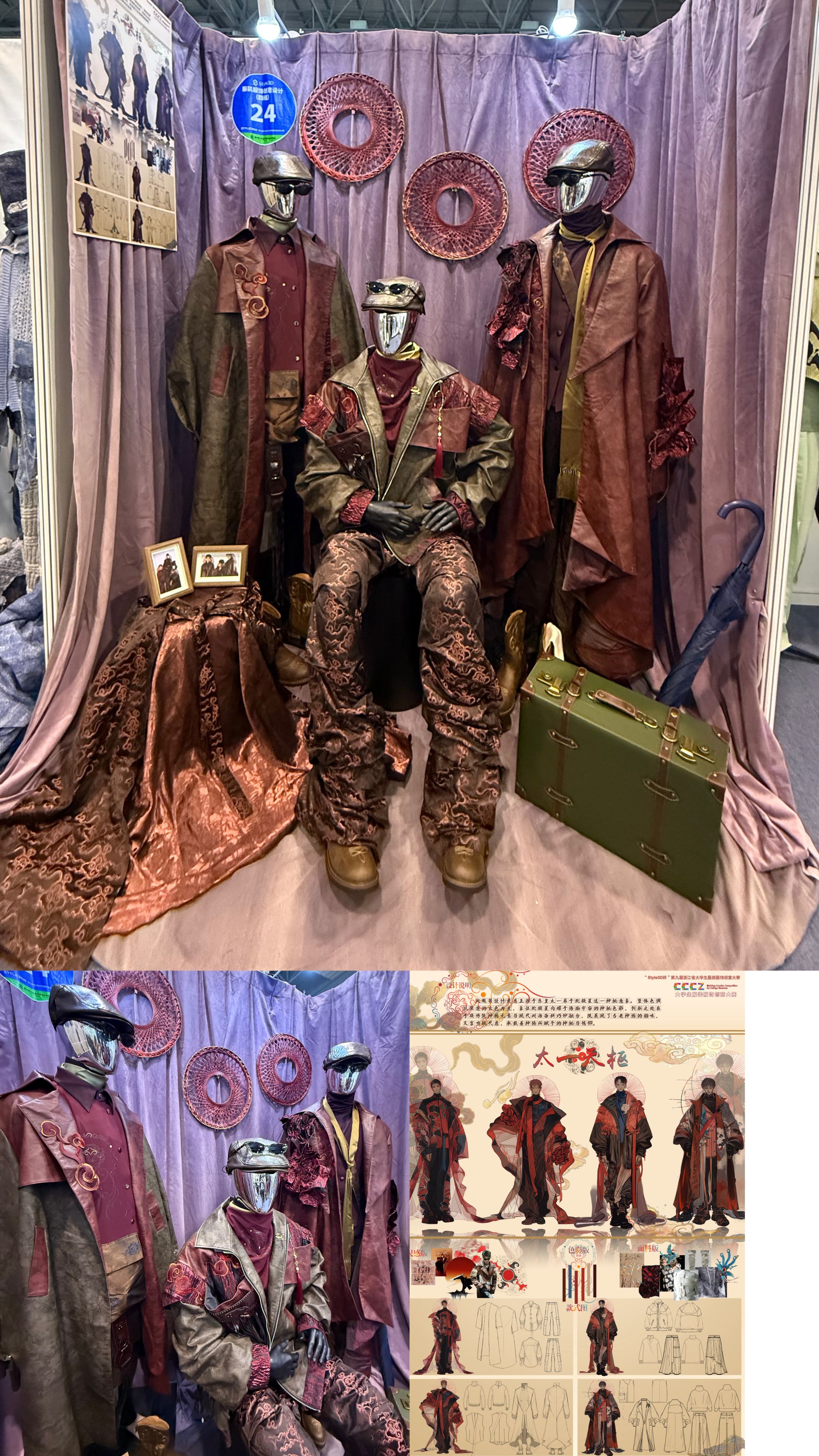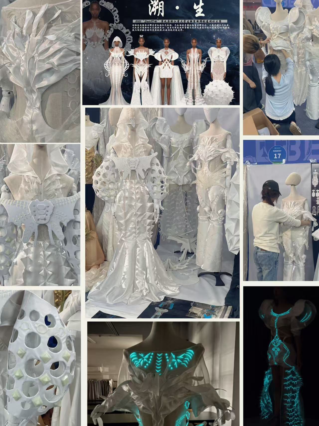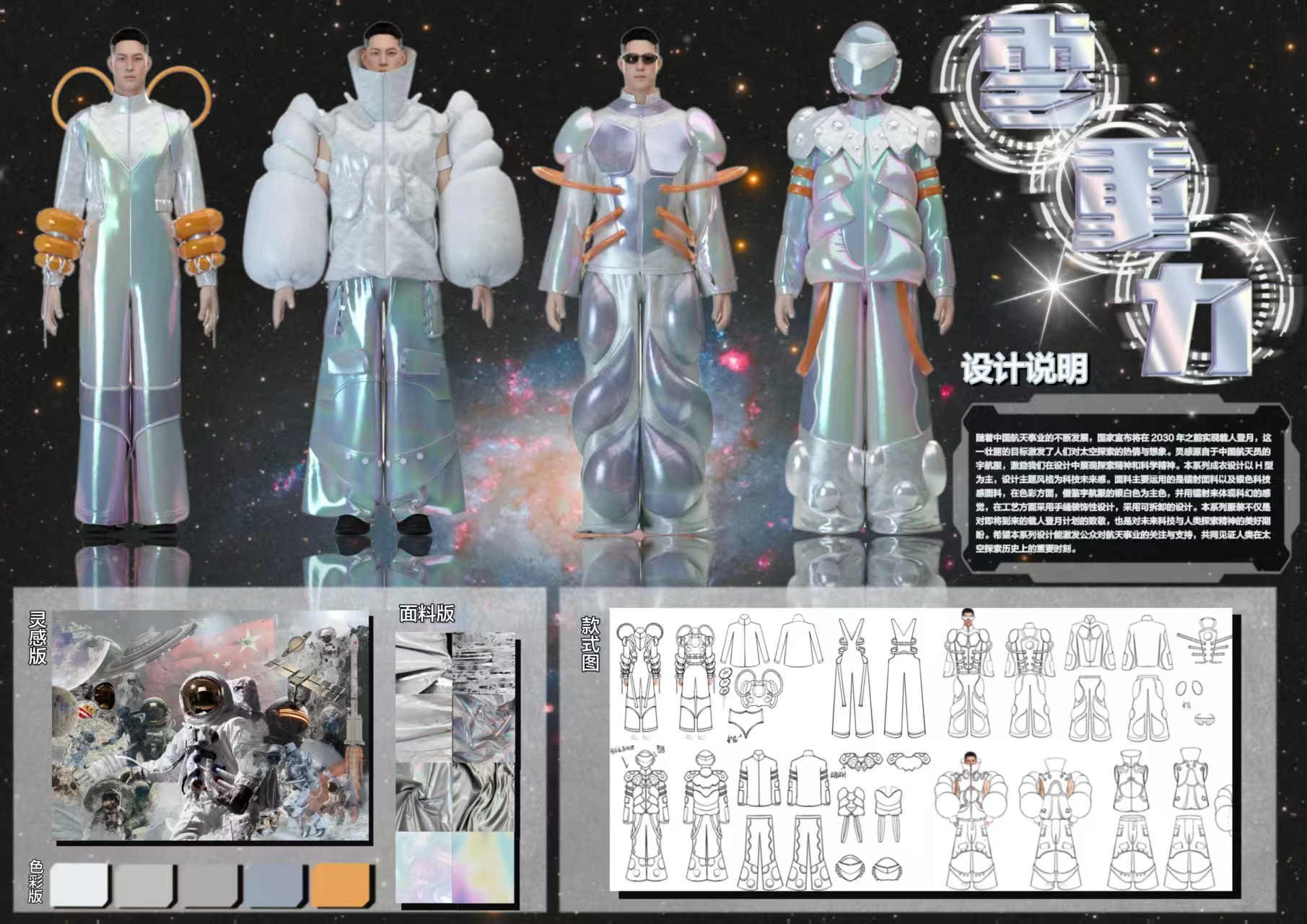 决赛阶段包含实物展示、现场制作与现场答辩三个环节,全面考察学生的创新意识、实践能力与综合素养。在强手云集的赛场上,艺术设计学院服装与服饰设计专业的同学们凭借独特的创意构想、前沿的数字技术应用与精湛的现场表现脱颖而出。作品不仅深刻诠释了“共生”理念,更巧妙运用Style3D等数字化设计工具,将虚拟构想转化为充满生命力的时尚表达,赢得了评委的高度认可,为当代时尚设计注入了蓬勃的青春力量。