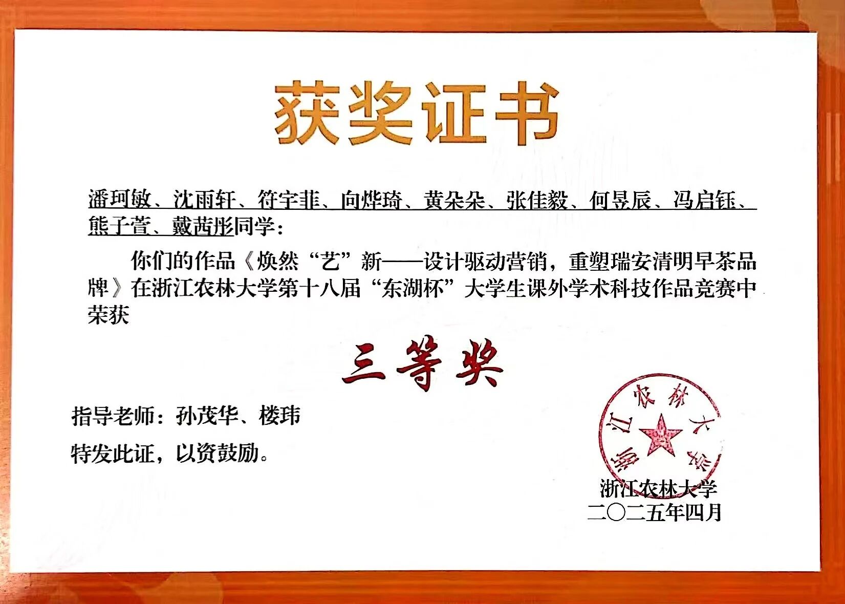 面对艺术类学生英语学习薄弱情况,他实施针对性策略突破。自制问卷开展“学情诊断”,构建“学期初规划、学期中辅导、学期末总结”的学业管理闭环,实现全过程引领。班级英语三级通过率达58.3%,国家英语四级通过16人(占比43%),六级通过4人(占比11%)。近三年累计34人次获校级奖学金,8人获省政府奖学金,6人获五好学生,1人获国家奖学金,6人获科研创新奖,学生潘珂敏获得视觉传达专业唯一推免研究生资格(专业首位),学风建设成效显著。