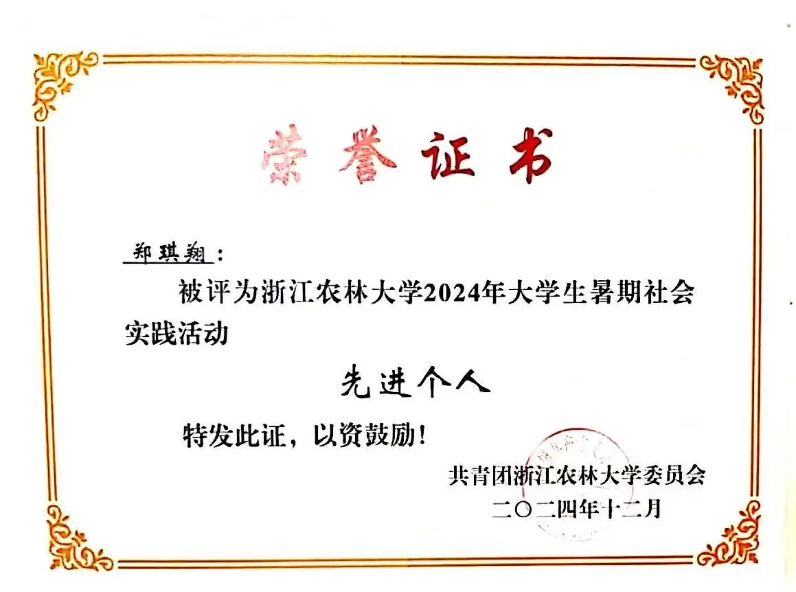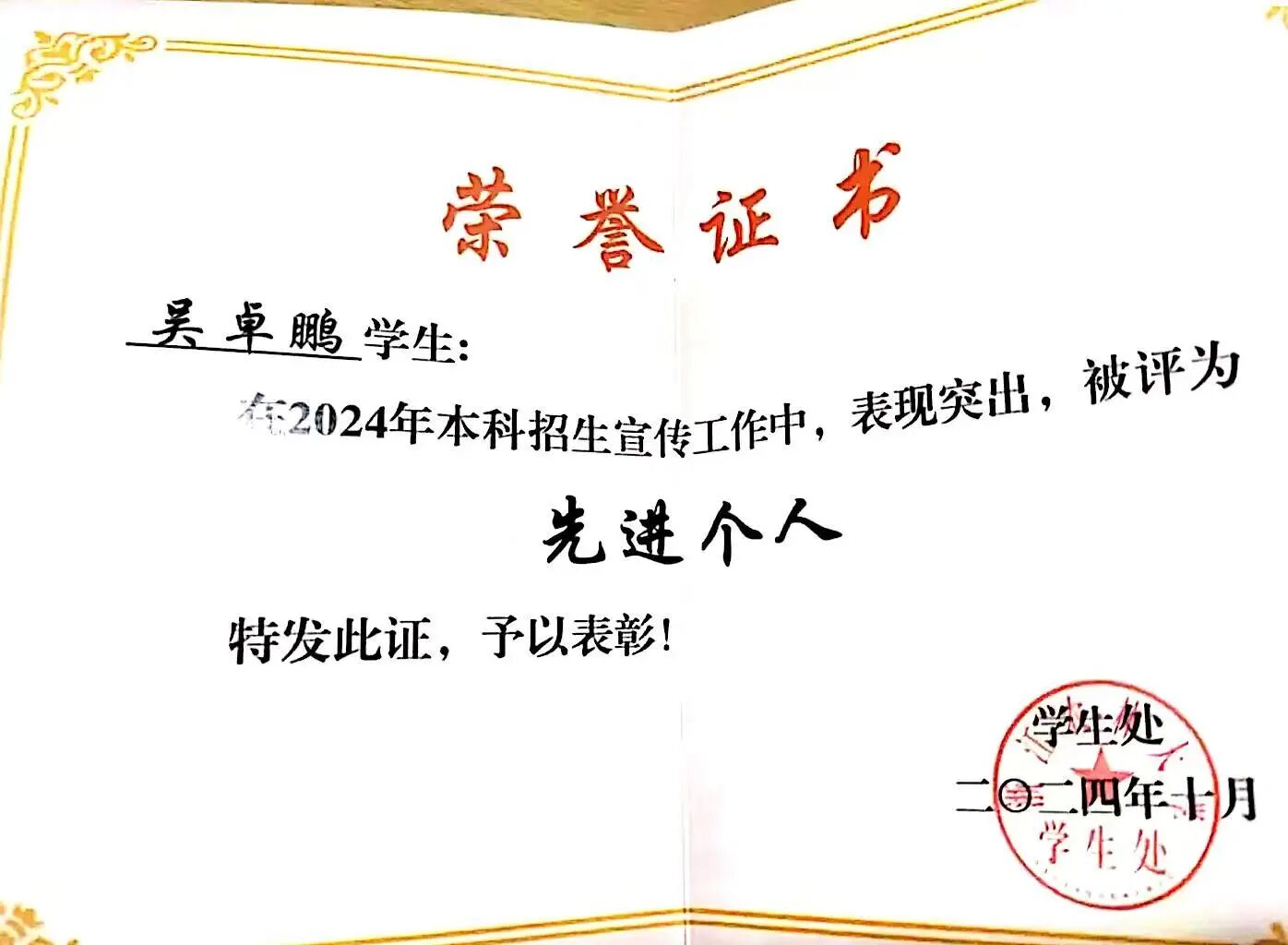在社会实践和志愿服务方面。班级同学积极参与社会实践和志愿服务活动,他们是勇于探索的“实践者”,是甘心奉献的“志愿者”。班级内郑琪翔、吴卓鹏等同学先后获评2024年暑假社会实践先进个人和本科招生宣传先进个人。