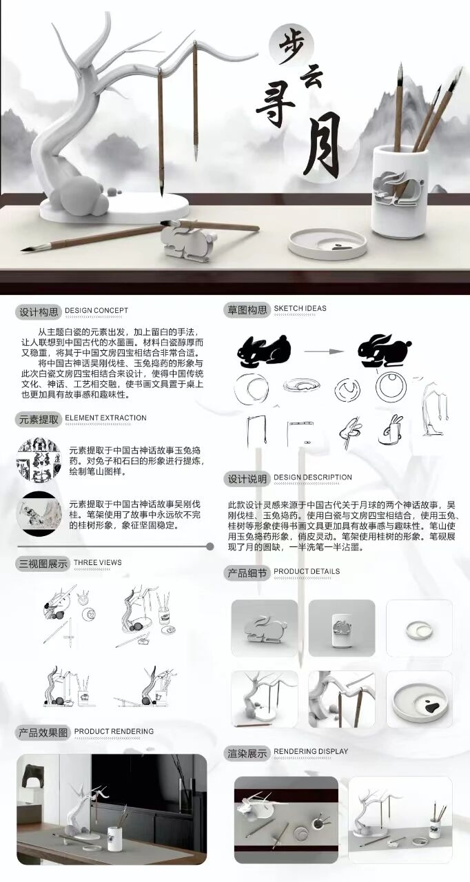 对虞皓逸而言,工业设计是兼顾热爱与适配度的理想选择。它是一门真正的复合型专业,既蕴含文科的思辨特质,又兼具理科的技术内涵。选择了工业设计专业,虞皓逸得以将自身的绘画兴趣与对自由灵活职业状态的期待融为一体。“生活中能接触到的一切,笔、桌子、电脑甚至医疗设备,都可能成为设计对象”,这是她对专业的理解。因此,她在填报高考志愿时将工业设计列为第一选择,成功开启了与设计专业相伴的大学时光。虞皓逸自认为在设计方面没有过人天赋,于是在设计工作中投入了更多时间和精力。在中国好创意暨全国数字艺术设计大赛中,她以“嫦娥奔月”“吴刚伐桂”的神话为灵感,将传统纹样融入文房四宝的经典形态,同时通过模块化设计升级使用体验。从前期的需求分析、草图构思,到三维建模时反复优化结构合理性,再到渲染阶段逐帧调整细节呈现,每个环节她都反复打磨,最终作品荣获中国风传统文化类一等奖。