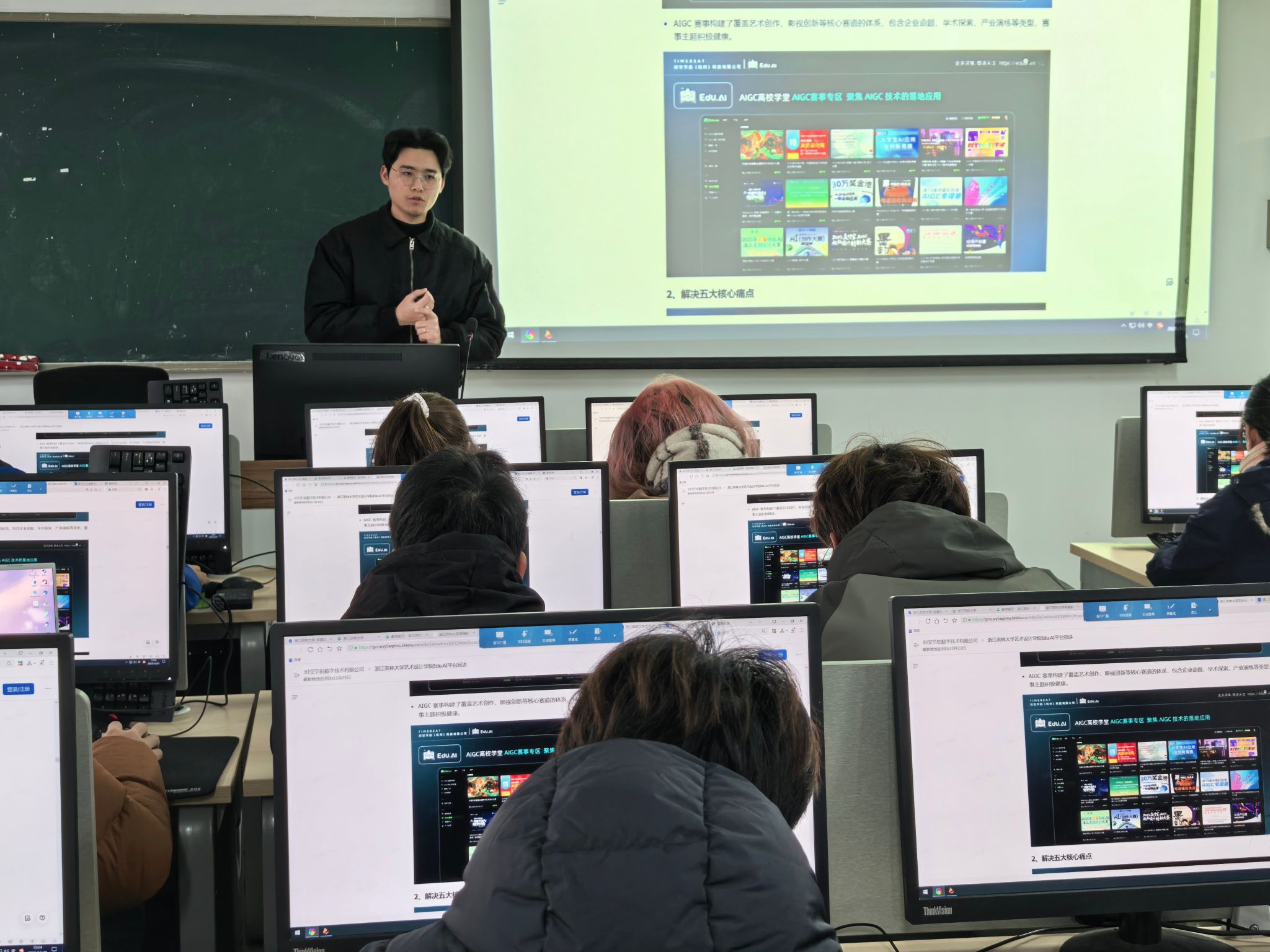 本次课程深度融入了“AI+”课程建设理念,依托校企合作实践平台,聚焦前沿技术应用。课堂上,张誉耀详细介绍了包括即梦AI、可灵、混元大模型在内的多款主流AIGC工具在工业设计场景下的具体使用方式与实践技巧,以及“Edu.AI”一站式智能创作与教学管理平台的功能效果。他强调,单一模型已难以满足复杂创作需求,关键在于构建“基于学科的多模态模型交叉工作流”。