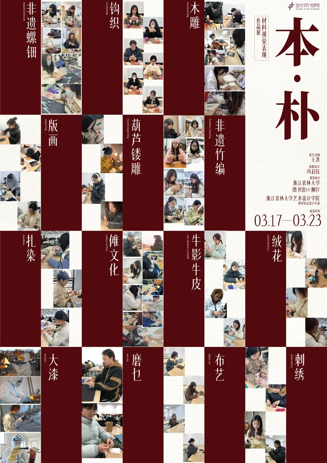 本次展览以“本·朴”为主题,集中呈现了学生在课程中围绕材料语言、视觉转化与文化表达所进行的探索与实践。《材料视觉表现》课程作为学院美育课程体系与“课程思政”建设的重要组成部分,坚持以材料为载体,深度嵌入思政育人元素,引导学生突破想象力与创造力的边界,鼓励学生通过对非遗传统文化与技艺的深入研究,尝试运用多种综合材料与可实现工艺,进行非遗元素的当代转化与创新设计,在实践中深化对“红色”设计基因与“绿色”生态素养的理解。