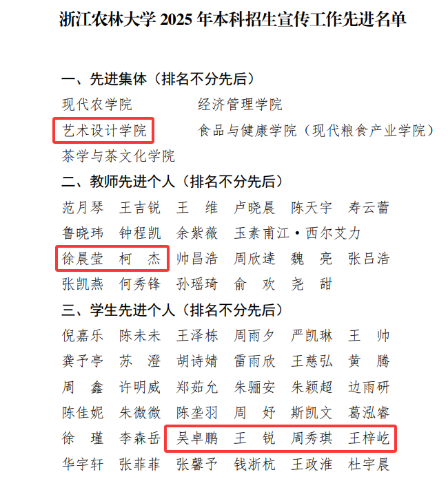 2025年11月4日,浙江农林大学学生处发布《关于表彰2025年本科招生宣传工作先进集体与先进个人的决定》,艺术设计学院凭借在本科招生宣传工作中的扎实举措与突出成效,获评“2025年本科招生宣传工作先进集体”。其中,徐晨莹、柯杰荣获“教师先进个人”,吴卓鹏等同学荣获“学生先进个人”。