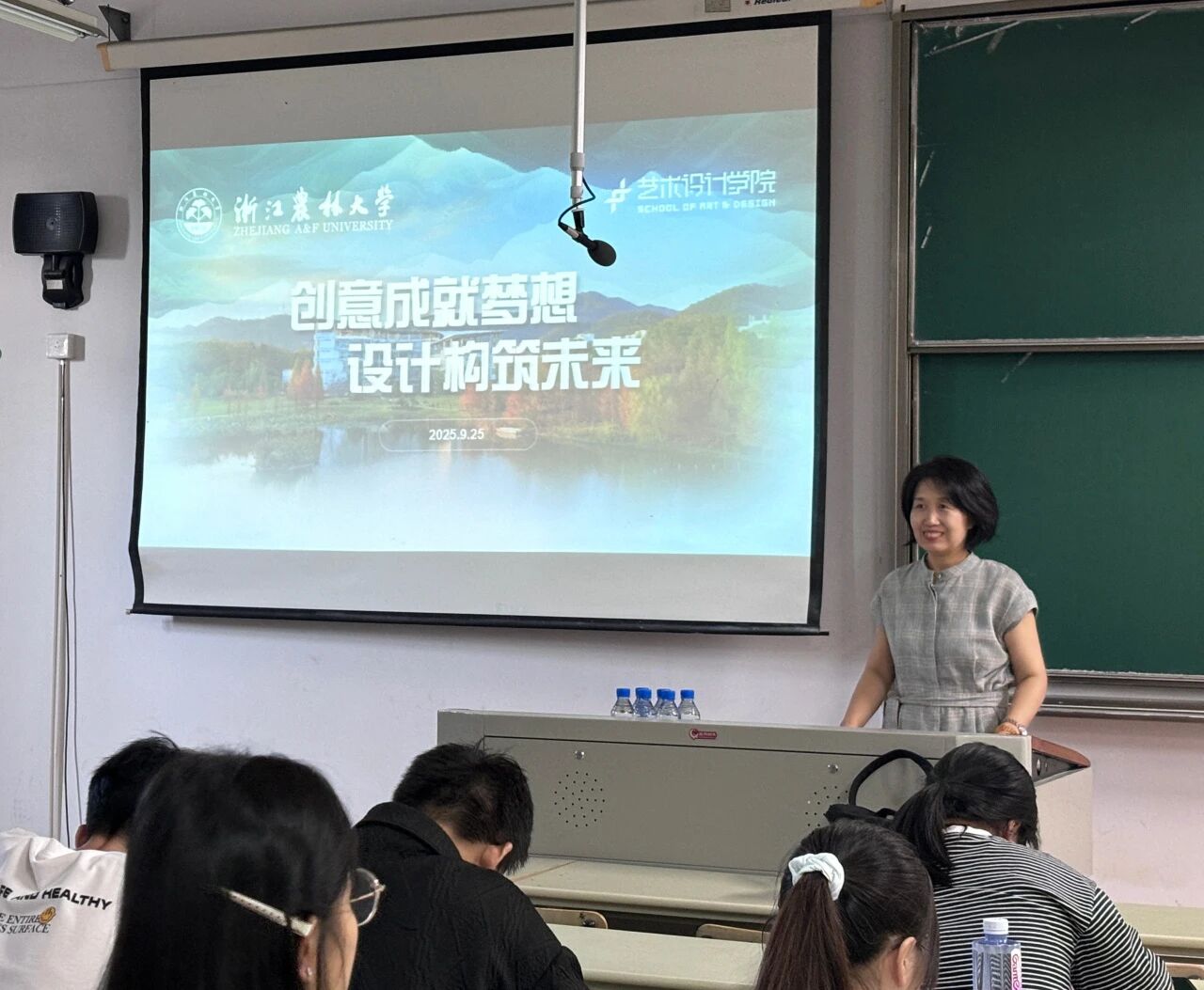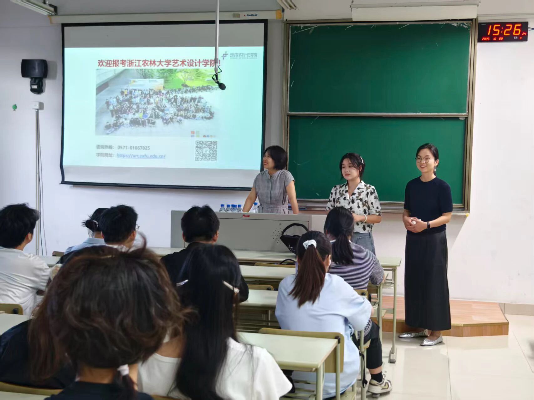 在宣讲交流过程中,副院长李宣为考生们详细介绍了浙江农林大学及艺术设计学院的总体情况,包括学校学位点设置、办学条件、学科特色以及人才培养成果等内容。浙江农林大学艺术设计学院始终致力于推动艺术与科技、设计与生态的交叉融合,不断优化学科布局,强化实践教学,为学生成长成才搭建多元平台。学术副院长孙杰围绕招生政策、专业设置及课程体系等问题进行了补充说明和现场解答,使现场学生对浙江农林大学艺术设计学院有了更为直观和深入的了解。