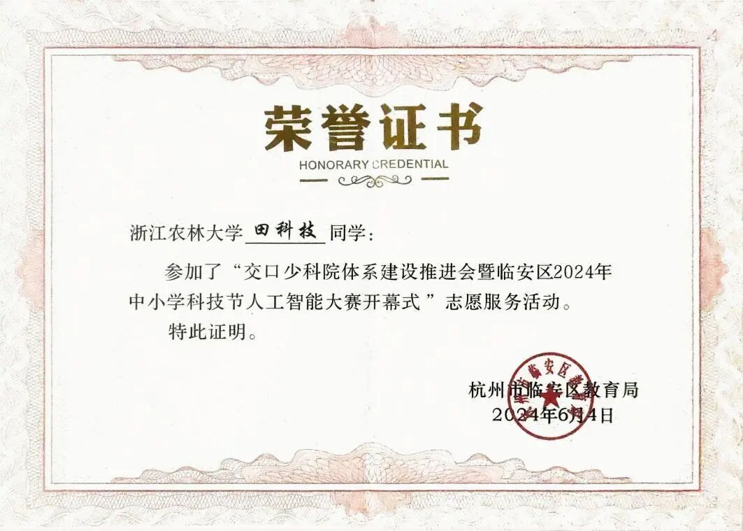 2024年6月1日,田科技作为负责人带领志愿者团队,参加了在浙江工业大学举办的“习近平生态文明思想宣讲大赛”。在展示交流环节,他向在场评委和师生介绍了浙江农林大学在生态文明建设方面的特色实践与成果。此外,他还曾作为负责人带领校志愿者团队,参与“交口少科院体系建设推进会”志愿服务活动并获得荣誉证书。回忆起这些志愿服务经历,他感叹道:“这次经历极大地开阔了我的视野,让我跳出了单一的实践者角色,成为一个生态文明思想的传播者和学习者。我从一场场宣讲中,看到了各校的青年们如何用创新的方式践行和传播生态文明理念,也更系统地理解了“绿水青山就是金山银山”的深刻内涵。”