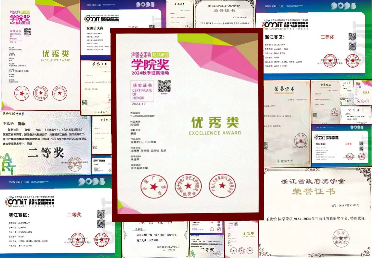 优秀的成绩和过硬的专业能力离不开努力与实践,王欣怡在课业之余参加了多项设计比赛,并取得了优异成绩,她曾获2024年秋季中国大学生广告艺术节学院奖优秀类;2025年春季中国大学生广告艺术节学院奖优秀类;2025年第十三届全国大学生数字媒体科技作品及创意竞赛浙江赛区二等奖;2025年第十三届全国大学生数字媒体科技作品及创意竞赛浙江赛区三等奖;2025年第十三届全国大学生数字媒体科技作品及创意竞赛全国总决赛三等奖等。