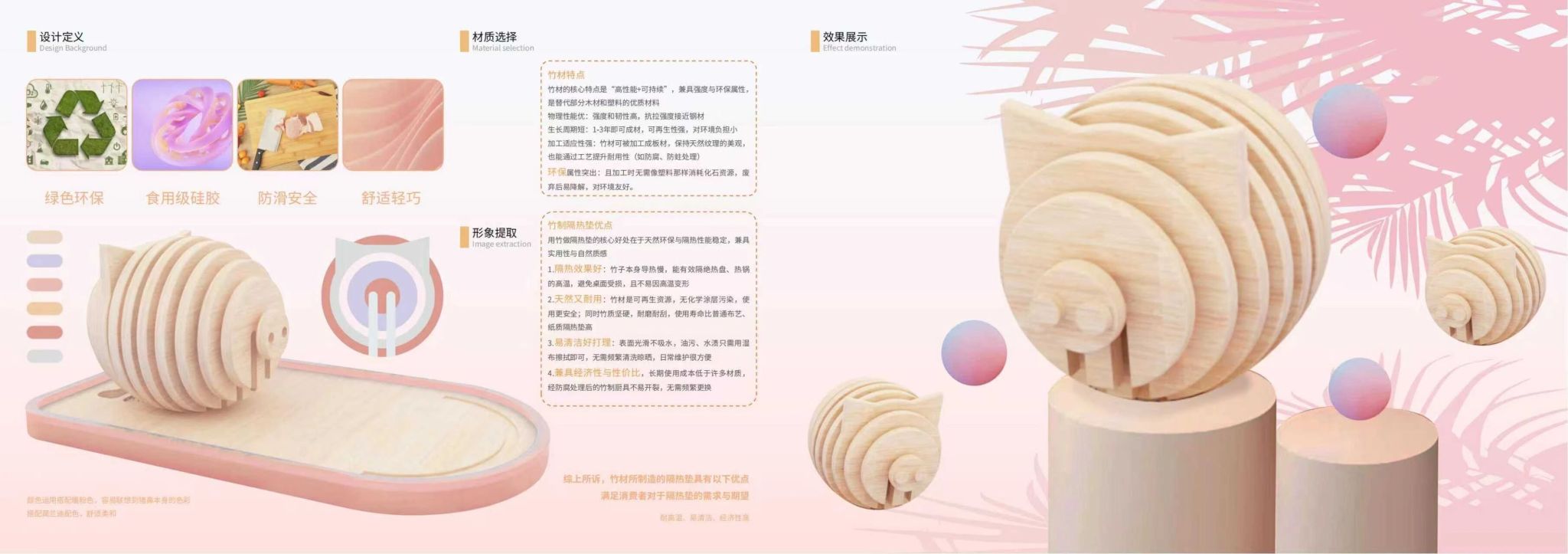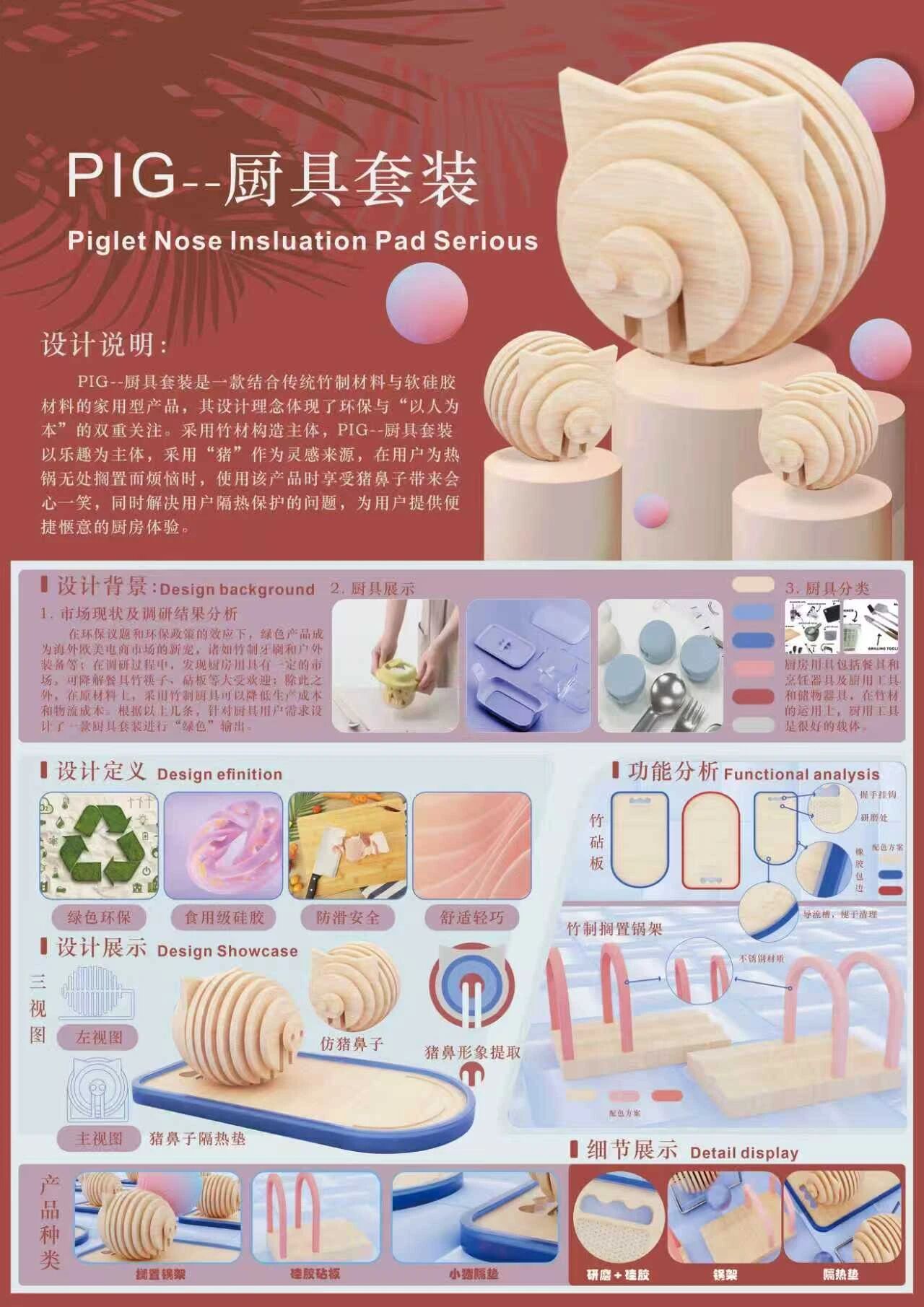 “设计不是空想,要能回应市场需求。” 姚敏的竞赛成果,始终围绕 “实用” 与 “创新” 展开。2025年8月,她以第一作者身份设计的 “PIG厨具套装”,获未来设计师・全国高校数字设计艺术大赛省一等奖;同期,她带队完成的 “扁平化家具设计”作品和“儿童益智玩具设计”作品,均获第十九届中国好创意暨全国数字艺术设计大赛省一等奖。此外,她还参与米兰设计周中国高校设计学科师生优秀作品展并获得省三等奖,主持大学生创新创业训练项目,探索 “蜗居青年居住空间家具解决方案”,设计出可拆分的 “桌之凳”。此外,她还发表了论文《建筑废弃物制备免烧绿色墙体材料关键技术可行性研究》,展现了跨领域科研视野。