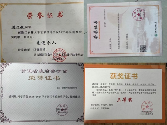 潘珂敏,女,中共党员,艺术设计学院视觉传达设计221班学生。绩点为4.25,连续三年获得校级一等奖学金,国家奖学金,连续两年获得浙江省政府奖学金等,以及五好学生和优秀学生干部等荣誉称号一次;在学科竞赛方面,曾获得2024年米兰设计周国赛一等奖,“挑战杯”校级三等奖,创新创业大赛校级铜奖,暑期社会实践优秀个人等荣誉奖项,发表论文《瑞安清明早茶品牌形象传播的设计策略与文化传承研究》1篇。